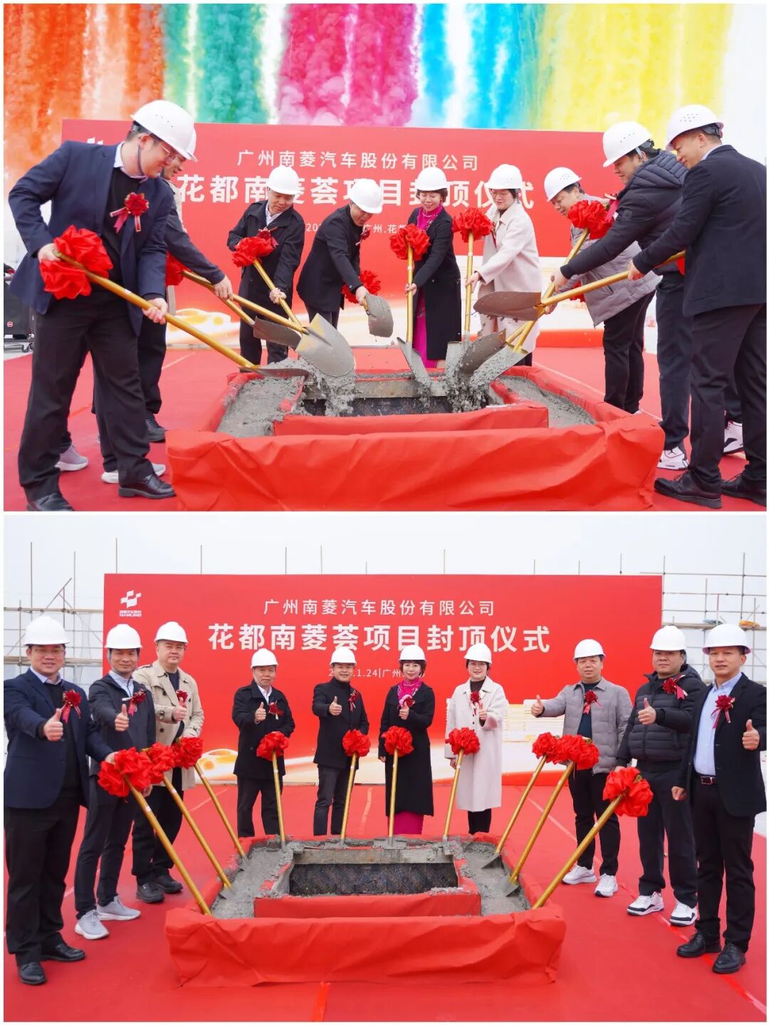 2026年1月24日,由南菱汽车投资建设的花都南菱荟项目隆重举行封顶仪式。花城街道办党工委书记黄俊杰、花都区妇联主席张健,以及花都区政府部门代表、行业协会嘉宾、产业链合作伙伴与南菱汽车董事长马春欣、董事兼副总经理乔永超等高管团队、项目建设团队共同出席,见证了这一重要时刻。